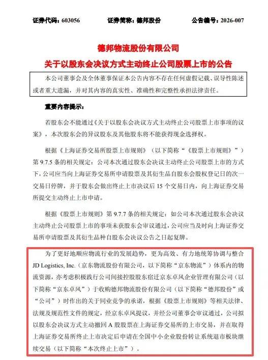就在3月的最后一天,德邦股份宣布正式终止上市及摘牌,成为2026年A股首家主动退市的公司,并表示退市后将全面"合体"京东物流体系,深度实现战略部署。