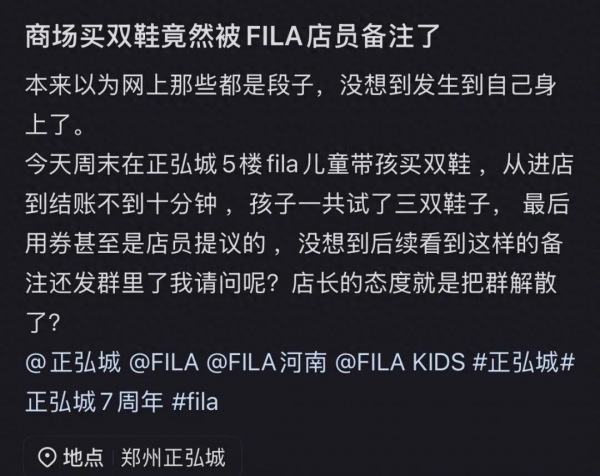 有网友发帖爆料,自己在商场5楼FILA KIDS店带孩子买鞋,从进店到结账全程不到十分钟,孩子仅试穿三双鞋子,最终使用的优惠券还是店员主动提议的,没想到事后竟发现被店员贴上"买双鞋子都嫌贵"的负面标签,相关客户信息截图还被发到了会员群内。