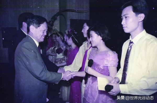 图为1995年6月10日晚,杨振宁在观看由我校师生自编自导的文艺演出后,与演员们亲切握手。