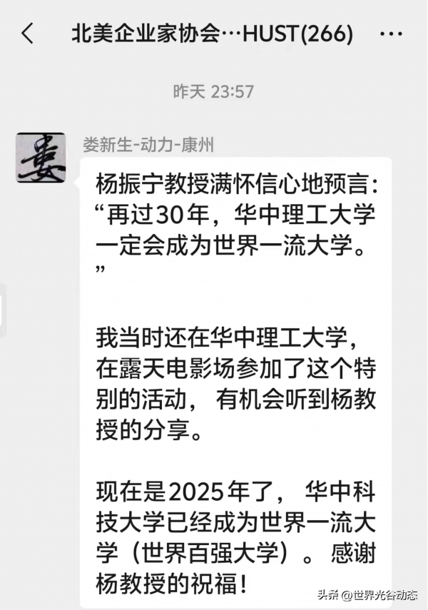 2007年9月,杨振宁重返华科大校园。彼时他感慨于校园的巨变和中国的发展奇迹,并对在场的华科大学子寄予厚望:"相信华中科技大学的学生都会意识到在这样的大时代,你们可以做出对国家、社会更大的贡献!"杨振宁的鼓励,延续着他对青年和未来的信念。