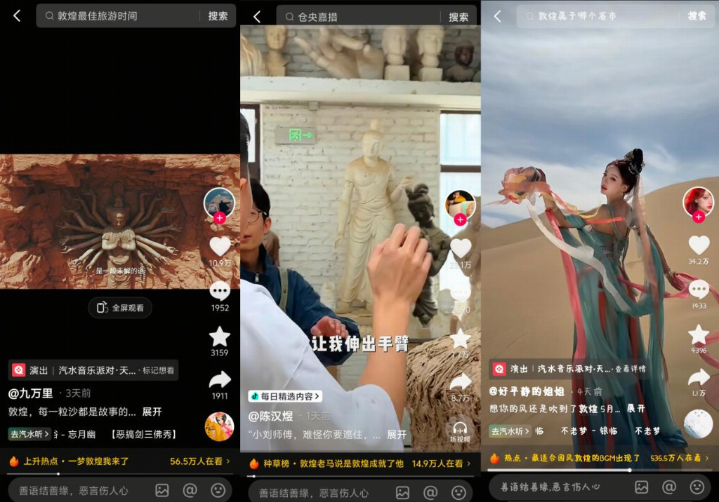 在敦煌,我们用一周时间挖掘城市基因。国风文化宣传者陈汉煜走进工匠村,讲述"神塑佛龛"背后无名匠人的坚守;抖音创作者们围绕"音乐与城市文化"自由创作,让敦煌在Z世代眼中不再是课本里的符号,而是有温度的故事集合体;活动期间,#最适合国风敦煌的BGM出现了# 敦煌老马说是敦煌成就了他。