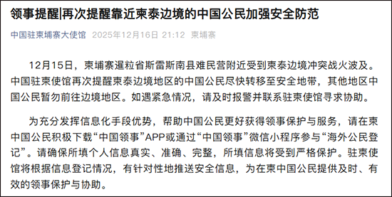 微信公众号"中国驻柬埔寨大使馆"12月16日消息,中国驻柬埔寨大使馆再次提醒靠近柬泰边境的中国公民加强安全防范。全文如下: