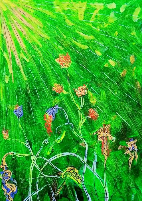 再看《生命的阳光》,画面中向上舒展的花瓣,用厚涂技法堆砌出了一种破茧而出的力量感。花瓣像是一个个努力挣脱束缚、追求光明的生命,它们层层叠叠,充满了立体感和质感,让人能感受到生命的坚韧与不屈。在经历了命运的无数次打击后,姜维用这幅画表达了自己对生命的热爱和对阳光的向往,每一片花瓣都是他对生活的热情回应。