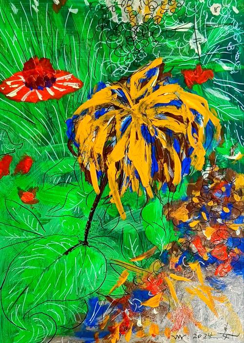 在创作《大卫霍克尼》时,他摒弃了传统肖像画对人物外在形象的精准复制,而是试图捕捉大卫霍克尼的灵魂特质。他用充满激情的笔触和大胆的色彩,勾勒出人物的神韵,让观者能感受到画中人物的独特魅力和内在精神 。而《妖娆的独秀》则是他对自然之美的深情礼赞,那绚丽的色彩和灵动的笔触,展现出花朵蓬勃的生命力,每一片花瓣都仿佛在诉说着生命的美好 。