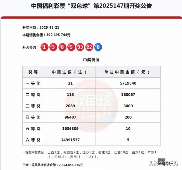 2025年12月21日晚,双色球第25147期开奖结果揭晓。一等奖井喷式爆发21注,单注奖金达到571.954万元,总奖金额突破1.2亿元。