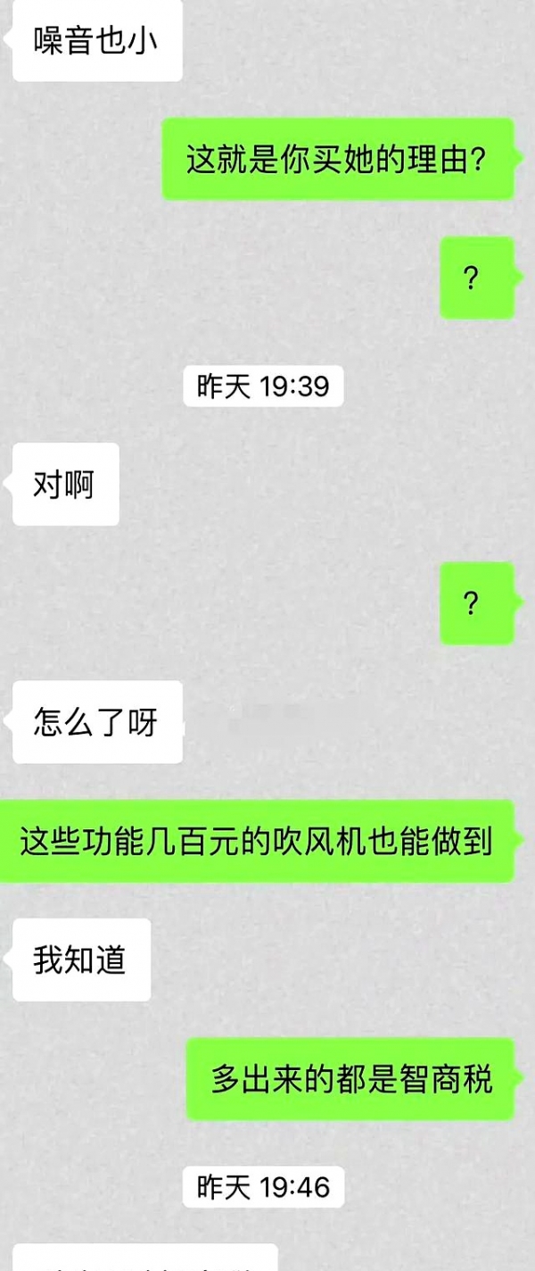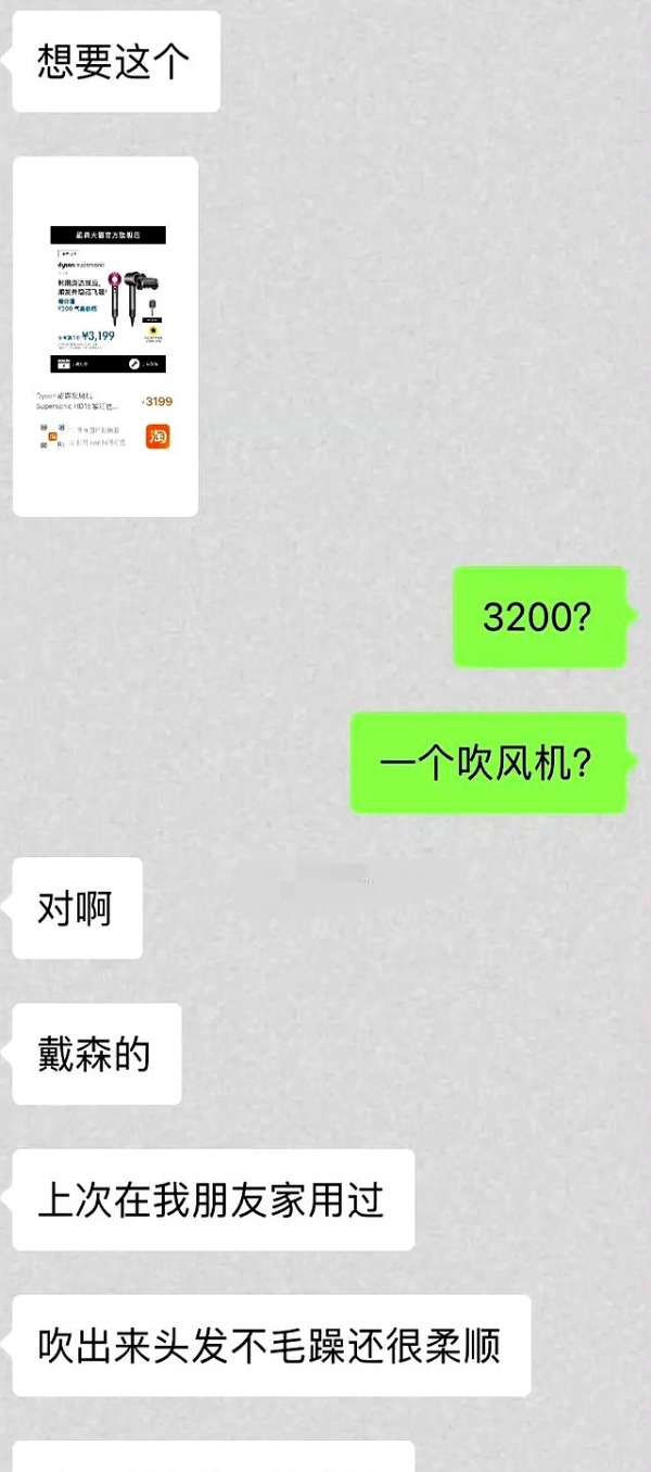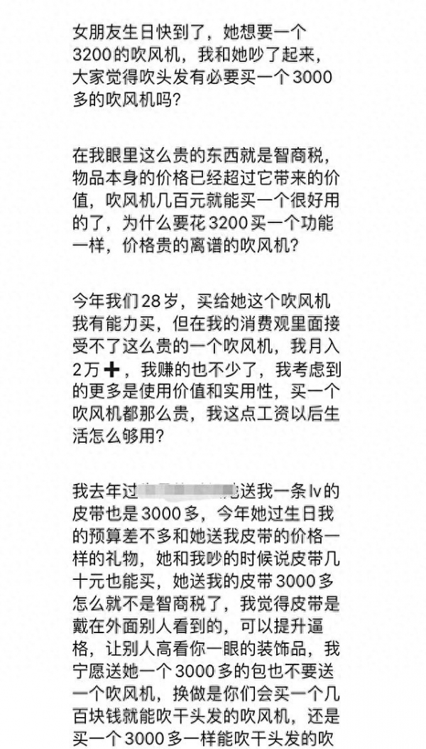 28岁的男士分享了一段关于生日礼物的争执,话题逐渐在网络上引起不小的风波,起因是女友提出生日想要一台价格3200元的吹风机,男方的第一反应并不是考虑买与不买,而是对这类小家电的价格产生了质疑,明明几百元的吹风机就能用得挺好,为何非得买动辄三千多元的高端款,他的月收入达到两万元以上,这个价位其实并不超出他的承受能力,但在消费理念上,他始终觉得这是一笔不理性的支出,甚至认为贵价吹风机带来的改善体验并不足以支撑商品溢价,直言"这就是智商税",对于同样预算,他宁可选一款包包送女友,也觉得比送吹风机体面多了