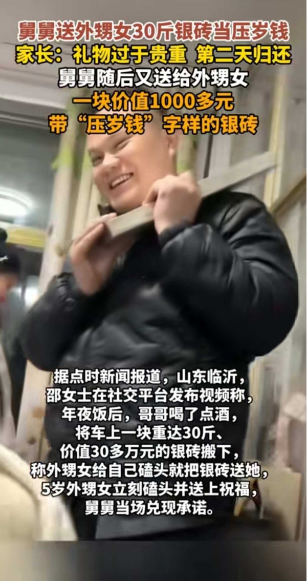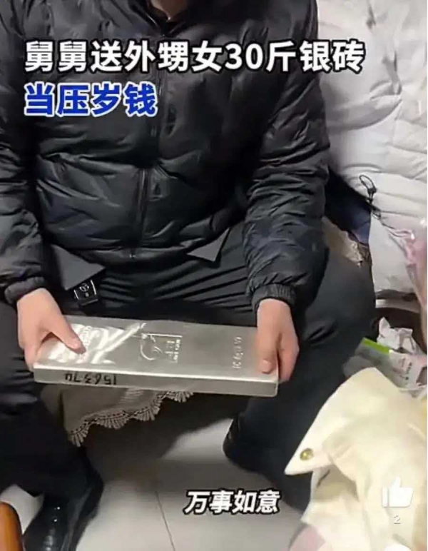 过年送礼本是亲情的表达,最近山东临沂发生的一件事,让不少网友都感叹"这礼物也太夸张了!"2月21日,邵女士在社交平台分享了自家一段年夜饭上的趣事:她5岁的外甥女给舅舅磕头拜年,舅舅竟然当场搬下一块重达30斤、价值30多万元的银砖作为压岁礼!