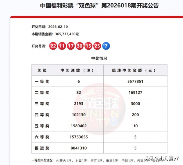 2026年2月10日(昨日),中国福利彩票"双色球"第2026018期完成开奖流程,当期全国彩票销售额达365,733,450元,摇出红球号码22、11、17、30、15、25及蓝球号码7。