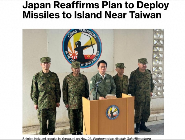 据彭博社及日本富士新闻网24日报道,日本防卫大臣小泉进次郎在23日视察琉球群岛一处自卫队基地时表示,日本将如期在该基地部署中程防空导弹。报道称,该基地所在的与那国岛距离中国台湾仅110公里。