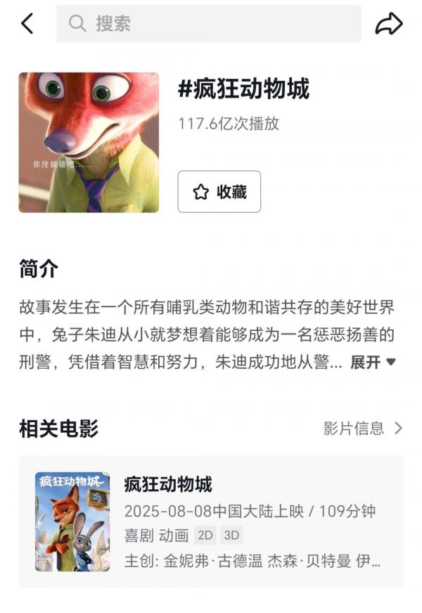 可《疯狂动物城2》显然不能按常理判断。抖音上的"疯狂动物城"话题下播放量超百亿次,而在迪士尼电影的官方账号上,播放量前十的视频全部都和两部《疯狂动物城》电影有关。