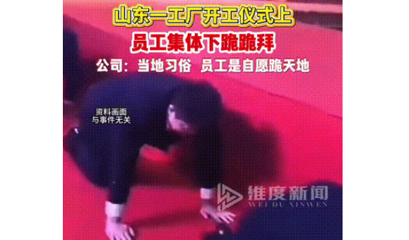 近日,山东滨州一工厂在开工仪式上,公司要求员工集体下跪并跪拜天与地,此等另类开工仪式被曝光后,引发许多人的质疑,对此该公司的工作人员进行了回应,表示这是当地的一种习俗,意思代表敬天与敬地,并没有强迫员工的行为,现场下跪的人都是自愿行为。