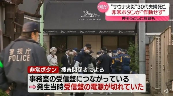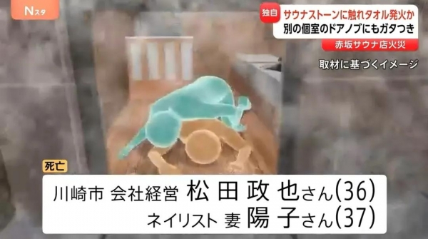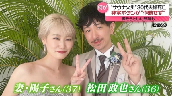 36岁的松田政也和37岁的松田阳子,是一对夫妻。被发现时,丈夫趴在妻子的背上,双双倒在桑拿间的门口。