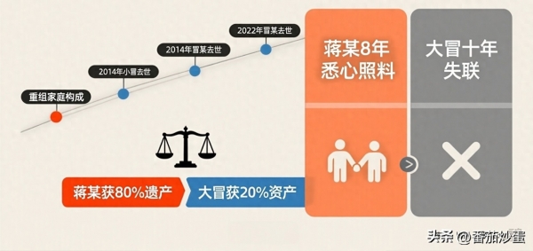 最后,法院没有按"血缘"来判。法官认定,蒋某作为丧偶儿媳,对公公尽了主要赡养义务,应当作为第一顺位继承人。大冒虽然也有继承权,但他多年未尽赡养义务,考虑到他支付过部分医疗费并承担了丧葬费,酌情给了他20%的份额。剩下的80%,判给了蒋某和她的女儿。