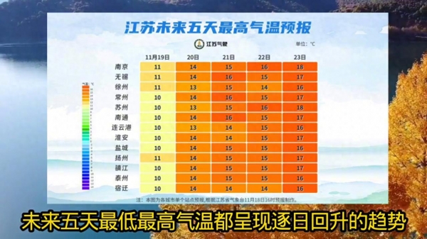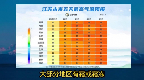 零下三摄氏度霜冻,江苏遭低温暴击!好消息是要升温了!受前期强冷空气影响,今天早晨气温持续走低,部分城市低至零下三c左右,且大部分地区有霜或霜冻。早出晚归的朋友注意防寒保暖。未来五天最低、最高气温都呈现逐日回升的趋势。今天各地最高气温就能回升到十到十一摄氏度,二十一号起普遍能重回十五摄氏度以上,寒意也会褪去不少。