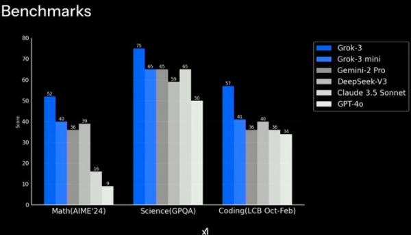 此外,Grok 3和Grok 3 mini在数学、科学和编程基准测试上超越了所有主流模型,包括GPT-4o、Claude 3.5 Sonnet、DeepSeek-V3和Gemini-2 Pro等。