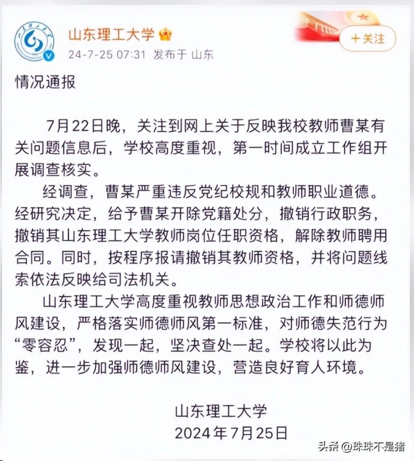 山东理工大学于7月25日早晨发布通报,确认曹某严重违反党纪校规和教师职业道德,决定开除其党籍,撤销行政职务,并解除教师聘用合同,同时按程序报请撤销其教师资格,并将问题线索依法反映给司法机关。