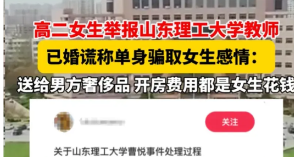 山东省淄博市一名女高中生露露(化名)于7月24日举报山东理工大学教师曹某婚内出轨、欺骗感情。