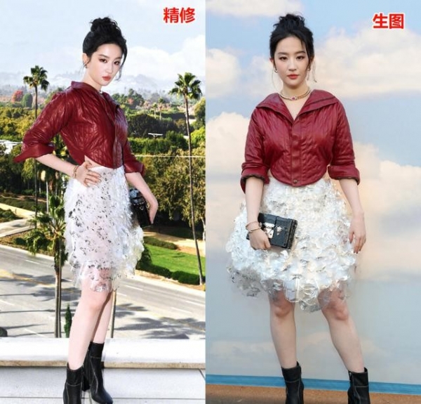 更逗的是,有眼尖的网友扒出来,国内发的照片里,腰那里P图没P好,手边都成波浪线了,这下跟国外的生图一比,简直是公开处刑。