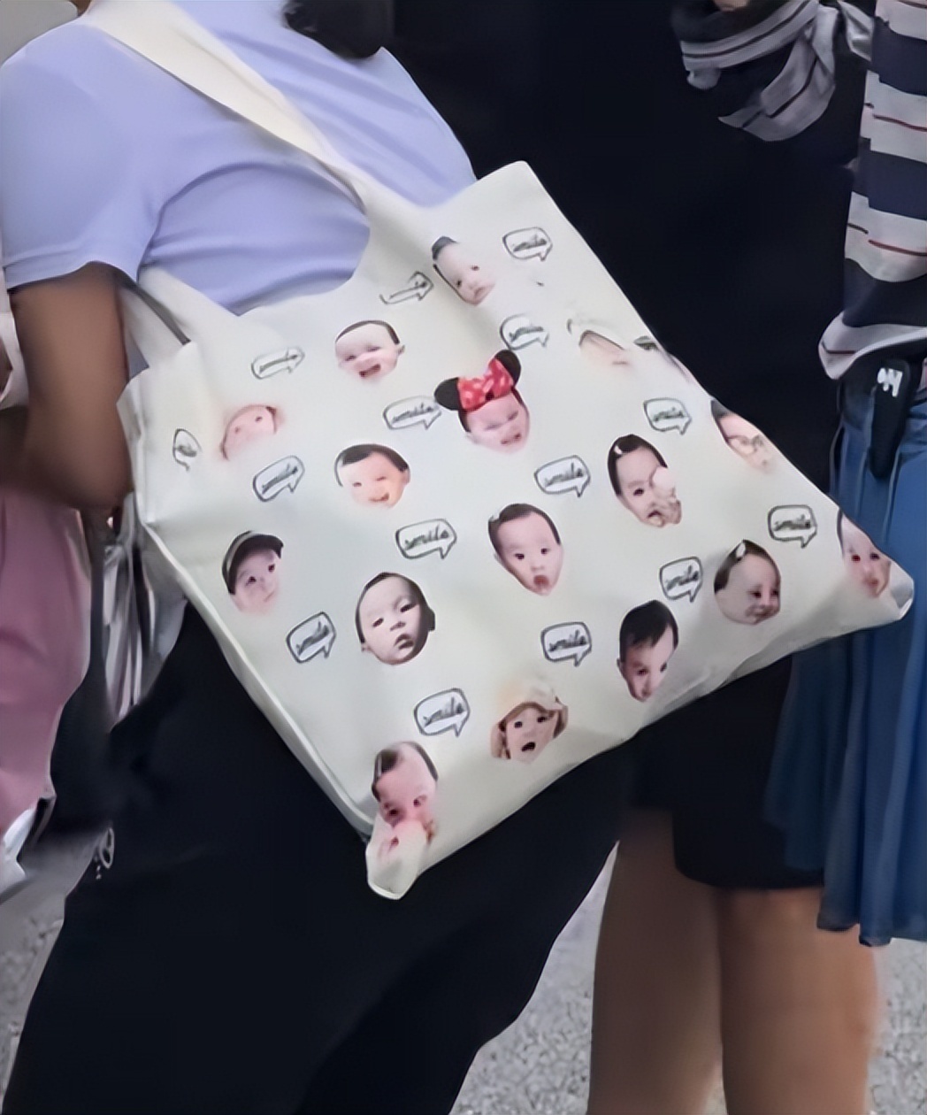 有意思的是,孙骁骁和任重还特意用女儿大头照定制了帆布袋,阿姨身上背的这个就是。从侧面可以看出,任重和孙骁骁都超爱女儿。