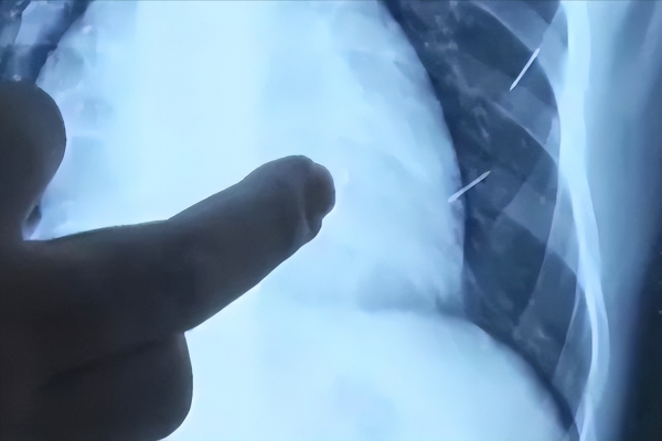 医生给他指着光片说道:"你看这里,这里,你的身体里一共有四个地方,扎着类似钢针的不明物。"