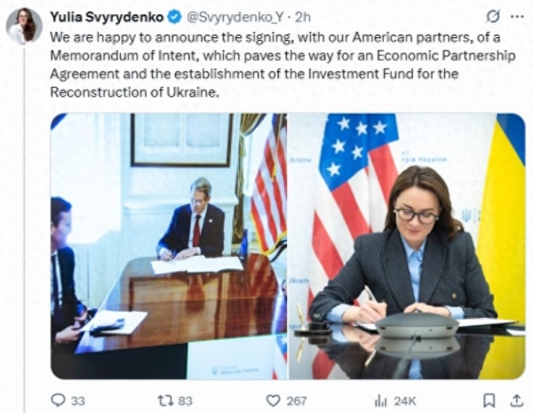 4月17号,乌克兰第一副总理、经济部长斯维里坚科发文证实,美乌已经签署了一份有关矿产协议的"意向备忘录"。