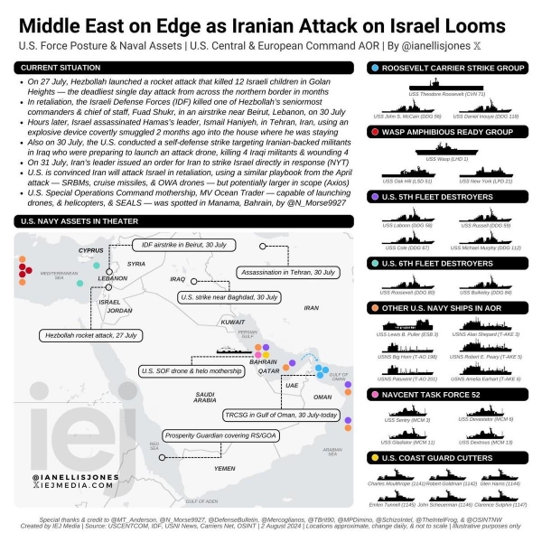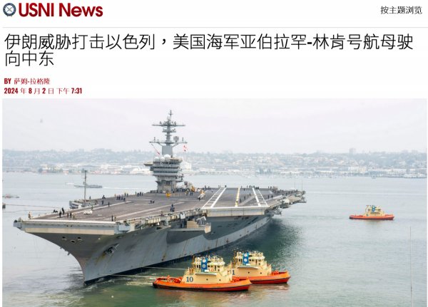 其实早在以色列承认对哈马斯最高领导人发起"暗杀"行动前,拜登就与内塔尼亚胡通了电话,重申了美国对以色列的安全承诺,并讨论了美国对以色列将要面对的弹道导弹和无人机威胁的防御问题,其中也包括美军为保护以色列而进行的军事部署。随后在8月2日,美国国防部就宣布将向中东增派一艘航空母舰,以及一个战斗机中队、海军巡洋舰和驱逐舰,并且还将部署更多的反导防御系统。