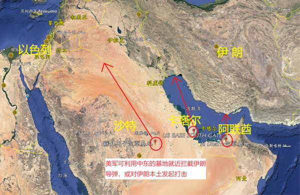 当然,这种让F-15E从英国基地长途奔袭3600多公里,只为帮以色列拦截一小部分伊朗导弹的做法其实并不划算。上次可能是因为事出紧急不得已而为之,但现在经过这两个多月的调动,美军应该已经在中东部署了一些战斗机备用。而此次美国国防部也宣布会再向该地区派遣一支战斗机部队。因此,现在美军就可以通过沙特的苏丹王子空军基地、阿联酋的达夫拉空军基地,以及卡塔尔的乌代德空军基地,对伊朗的导弹和无人机就近部署多层拦截网,尽量将威胁外推到远离以色列本土的地区。而利用这些基地的地理优势,美军甚至能在必要时对伊朗本土的军事目标发起"包围"打击。