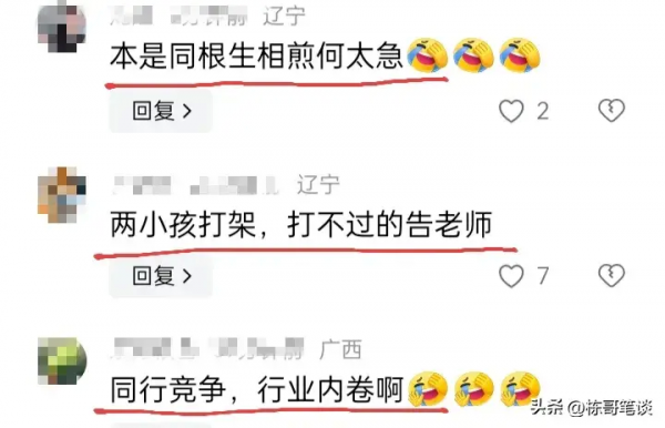 网友调侃道:本是同根生,相煎何太急,同行要一起发财,不要玩鱼死网破的事情,挨在一起才能形成口碑效应,不要总想着如何把对方搞垮,想一家独大。