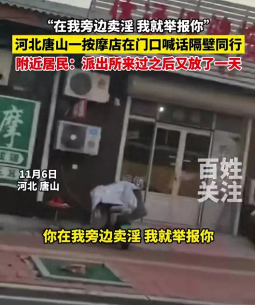 事情发生在11月6日,河北唐山曹妃甸区唐海镇一家按摩店门口放着一个大喇叭,一直对着隔壁同是按摩店的同行循环播放:"你在我旁边卖淫,我就举报你,敢卖淫,就举报你"!看起来真的是可乐又无奈。