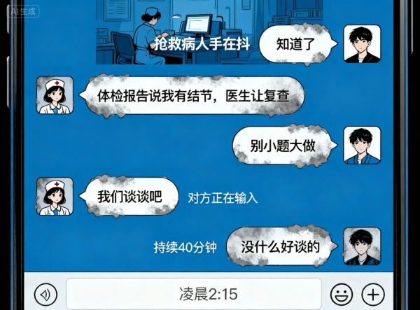 女方是护士,值夜班时发"抢救病人手在抖",男方三天后回"知道了";她发"体检报告说我有结节,医生让复查",他回"别小题大做";最后她发"我们谈谈吧",对话框显示"对方正在输入",输了40分钟,发来一句"没什么好谈的"。