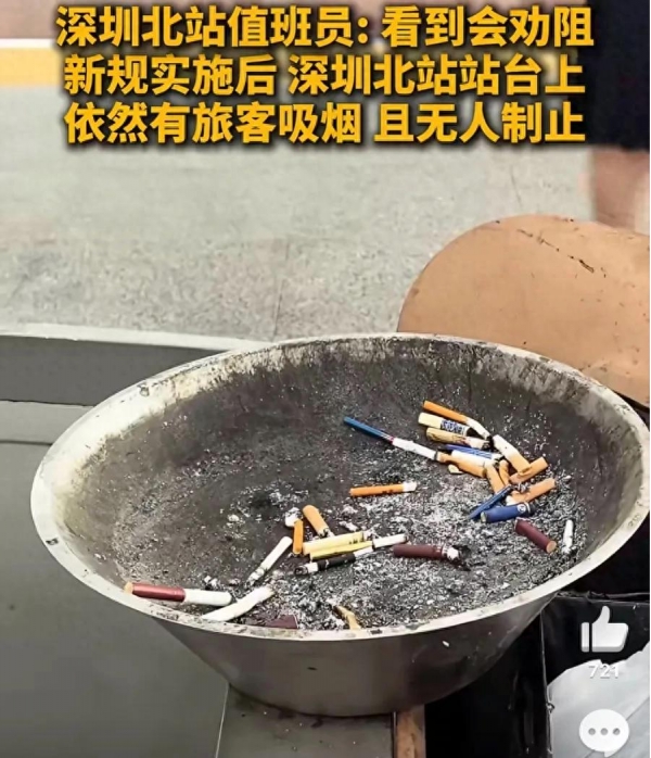 近日,广东深圳新规火车站站台全域禁烟,违规者面临50元至500元罚款,但新规实施后深圳北站站台上,依然有旅客吸烟且无人劝阻。近年来,多地二手烟受害者尝试通过12306、车站客服、地方政务热线等渠道投诉铁路站台吸烟问题,希望站台全面禁烟,或设置专门的吸烟室。