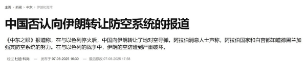 日前,一名"熟悉情报的阿拉伯国家官员"向《中东之眼》新闻网透露称:在伊朗和以色列达成停火协议后,中国在第一时间向伊朗运输了大批急需的防空系统等武器装备。