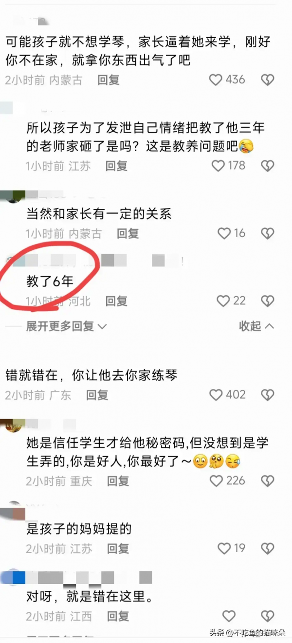 可能是孩子不想学琴,家长逼着她来学,刚好老师不在家于是就拿老师的东西撒气了吧!可是孩子为了发泄自己的情绪就把教了六年老师的家给砸了?这是教养的问题吧!错就错在不该信任别人!幸好她是把家里给砸了,而是没有选择伤害自己,否则,老师真的太冤枉了。