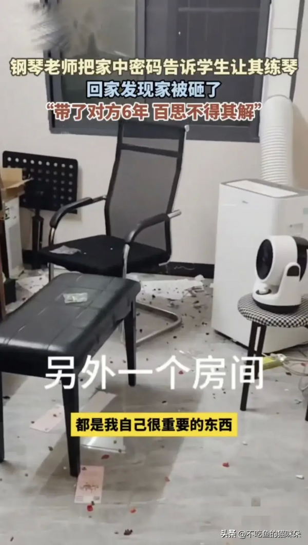 近日,在湖南永州,一位资深的钢琴老师在社交平台发布视频称自己教了六年的学生,特别信任她,就把家里的密码告诉了她,让她可以自己来练琴,没成想自己的信任被狗吃了,回到家里发现家被砸的一塌糊涂!