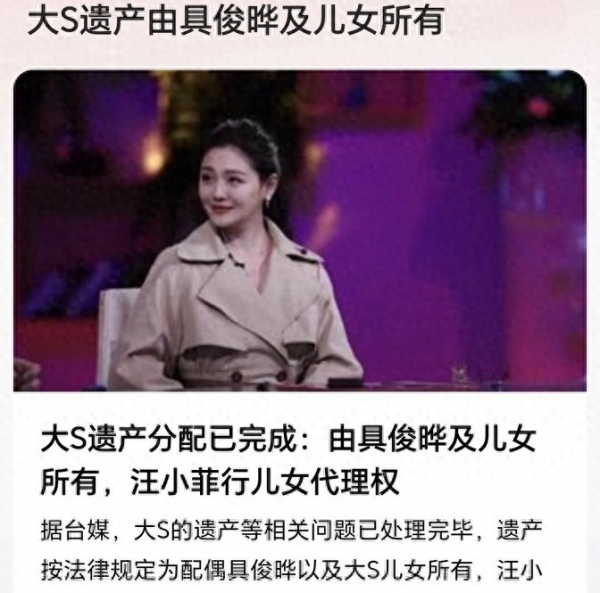 反转来得比电视剧还快!台媒3月2日爆出猛料:大S的2.3亿遗产全归现任老公具俊晔和两个孩子。更绝的是,10岁女儿小玥儿和8岁儿子小箖箖的监护权,居然被前夫汪小菲牢牢攥在手里!