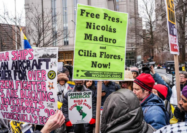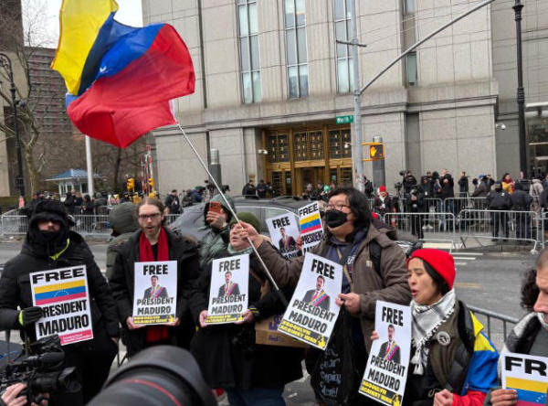 庭审开始前,纽约南区联邦地区法院外已聚集大批民众,现场气氛紧张。他们举着"释放马杜罗""不要向委内瑞拉开战"""美国滚出拉美"等标语横幅,不时高呼口号,对美方行动表示不满。