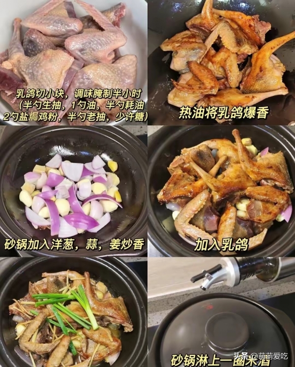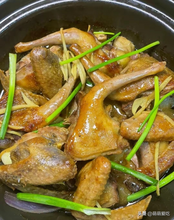 做法一点不复杂:乳鸽处理干净剁成块,冷水下锅焯个水,捞出来用温水洗干净。砂锅里放姜片、葱段,铺一层香菇、玉米块、胡萝卜块,再把鸽肉放进去,加足量温水(没过所有食材),放2勺生抽、半勺盐,大火烧开后转小火,盖着盖子炖1小时。掀开锅盖的瞬间,香味能飘满整个屋子,汤喝着鲜掉眉毛,鸽肉咬一口就化,老人小孩都爱吃!