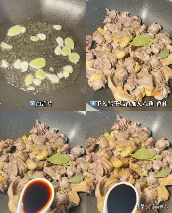 锅里放少许油,下姜片、葱段、干辣椒、1颗八角炒香,把鸭肉倒进去炒到表面微黄,再倒1罐啤酒(刚好没过鸭肉就行),加2勺生抽、1勺老抽、1块冰糖,大火烧开后转小火炖40分钟。