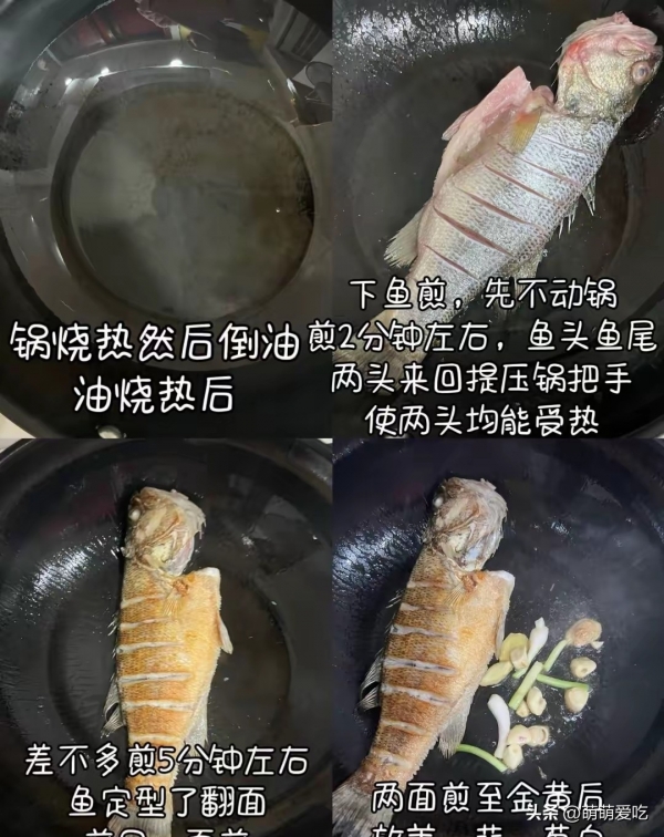 平底锅倒油,油温六成热时把鲈鱼放进去,中小火煎到两面金黄,盛出来备用。