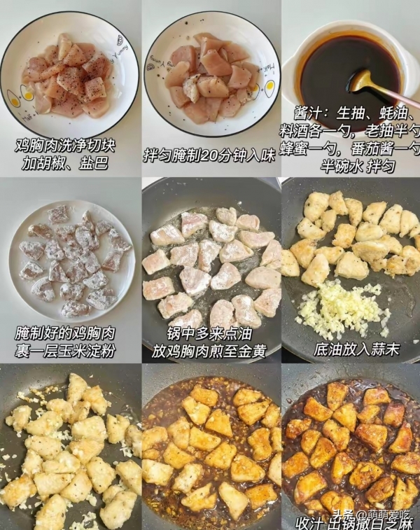 做法超简单,记好步骤:先把鸡胸肉洗干净,用刀背拍松(这样更入味),切成手指粗的条,放1勺生抽、半勺料酒、撒点黑胡椒,抓匀了腌20分钟。然后调个蜜汁,2勺蜂蜜+1勺生抽+半勺蚝油+1勺清水,搅和匀。平底锅刷点油,把腌好的鸡胸肉放进去,中小火煎到两面金黄,再把蜜汁倒进去,翻炒到汤汁裹满肉条就关火--咬一口甜滋滋的,肉还嫩得能飙汁,比外卖健康多了!