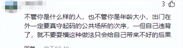 不管你是什么样的人,也不管你是年龄大小,出门在外一定要遵守起码的公共场所的秩序,一但自己违背了,就不要耍横这种做法只会给自己带来不好的后果