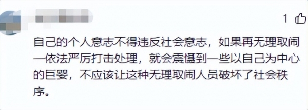 自己的个人意志不得违反社会意志,如果再无理取闹一依法严厉打击处理,就会震慑到一些以自己为中心的巨婴,不应该让这种无理取闹人员破坏了社会秩序。