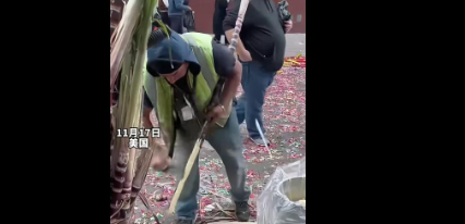 一大哥在美国街头卖紫皮甘蔗,9美元一根包削包砍。拍摄者丁先生:他是卖8美元一根,然后你要削皮的话,多收1美元。非常非常甜,就是结太多了,有点磕牙。
