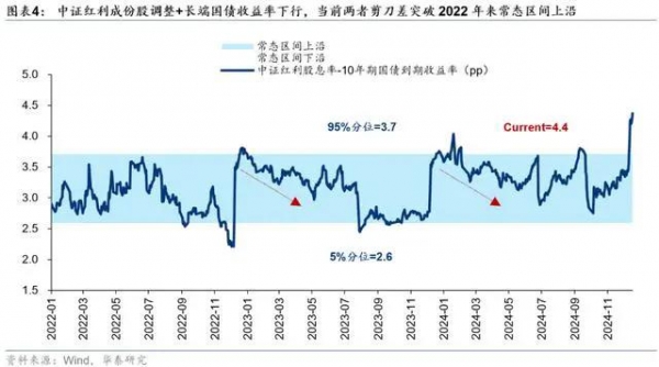 而截至上周五,红利股息率与10年期国债收益率剪刀差就已经突破2022年来常态区间上沿,在今日国债收益率再度下行之后,A股红利股吸引力进一步上升。
