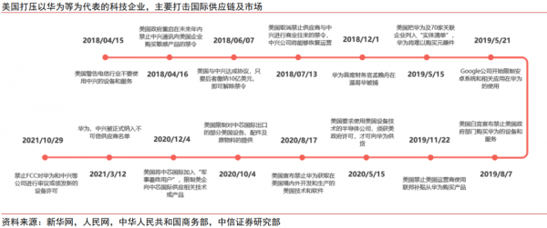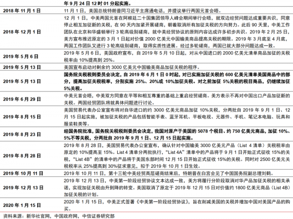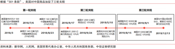 2018年以来,美方依据"301条款"对中国大规模加征三轮关税。第一轮关税于2018年7-8月对中国500亿美元商品加征25%关税;第二轮关税于2018年9月对2000亿美元商品加征10%关税,并于2019年5月将关税从10%提高到25%;第三轮关税于2019年9月对1200美元商品加征10%关税。随着贸易争端不断升级,美国将摩擦延伸至科技领域,对我国科技类企业的国际供应链和国际市场进行精准打击。总体而言,美国对我国加征关税的领域较广,涵盖了高端制造业与中低端制造业,且美国的加征顺序总体呈现先高端后低端、先低进口依存度后高进口依存度的特征。