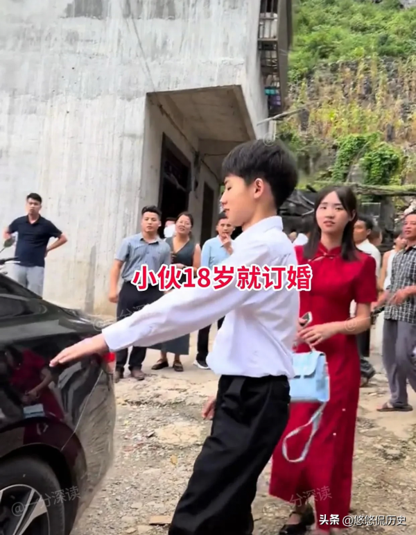 广西河池有个18岁男孩订婚了,他和未婚妻在村里摆了酒席,还拍了视频发网上。视频里俩人穿着正式,男方抱着花,女方穿红衣服,亲戚都来了,蛋糕三层那么厚。