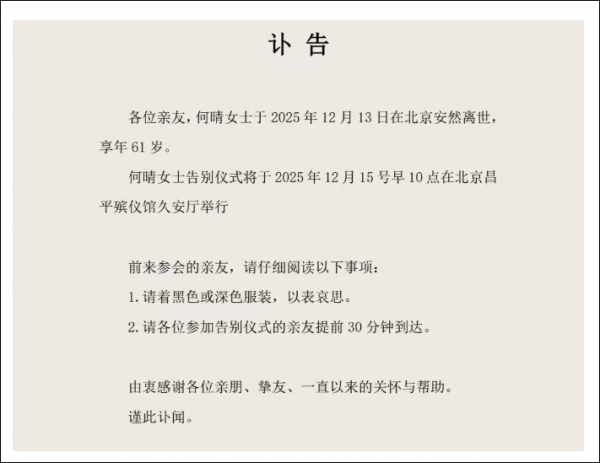 一份家属发布的讣告今天在网络热传,讣告称,曾出演过"四大名著"的女演员何晴于13日在北京安然离世,享年61岁。其告别仪式定于2025年12月15日上午10点在京举行。