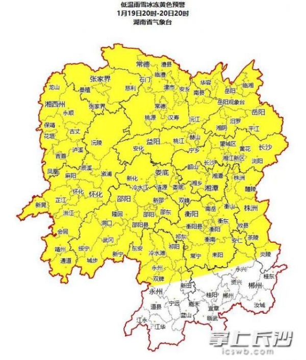 需注意的是,湖南省气象台今日16时继续发布低温雨雪冰冻黄色预警:预计19日20时到20日20时,全省大部分地区将出现冻雨、雨夹雪或雪,且最低气温将低于0℃。黄色预警区域包括长沙、株洲、湘潭、湘西州、张家界、常德、益阳、岳阳、怀化、娄底、邵阳、衡阳、永州中北部、郴州北部。