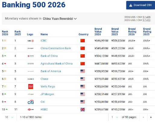 3月4日,全球权威品牌估值机构发布的《2026年全球银行品牌价值500强》榜单正式揭晓,工行、建行、中行、农行四大国有银行,直接包揽了榜单前四名,稳稳占据全球银行业的顶端位置,这实力真的没话说!