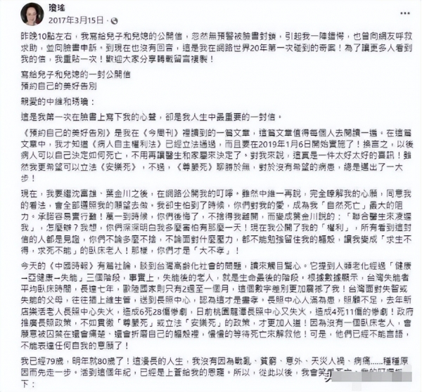 很多人可能会觉得琼瑶的做法太过于极端,但是她在信中也表示,最让她惧怕的不是死亡而是失智和失能。